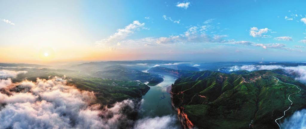 8月1日,被譽為“黃河入晉第一灣”的偏關老牛灣景區(qū)再現(xiàn)壯美日出云海奇觀。這里天藍水清,植被豐茂,?,F(xiàn)云海蒸騰、朝霞浸染的如畫景致,這醉人的美景,正是“綠水青山就是金山銀山”的生動詮釋。(記者馮曉磊攝)