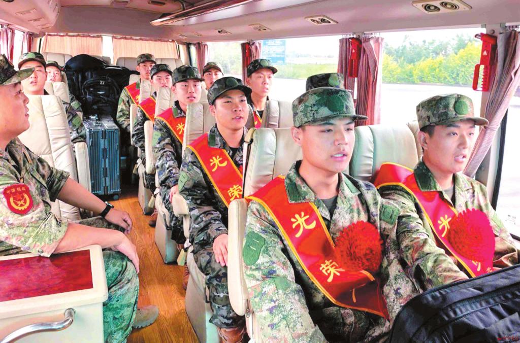 近日,定襄縣開展新兵入伍送兵活動。中巴車內,身著迷彩服的新兵們佩戴“光榮”綬帶與大紅花,精神抖擻、目光堅定。這輛承載著殷切期望的專車,將正式送他們踏上從軍報國的新征程。(郭婧蕾攝)