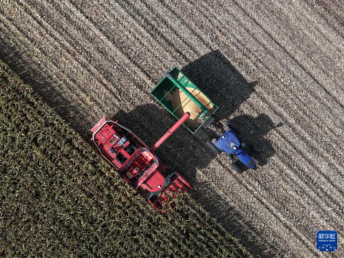 9月23日,在黑龍江北大荒農業(yè)股份有限公司友誼分公司一旱田地塊,大型農業(yè)機械在進行玉米收獲作業(yè)。(新華社記者 王松 攝)