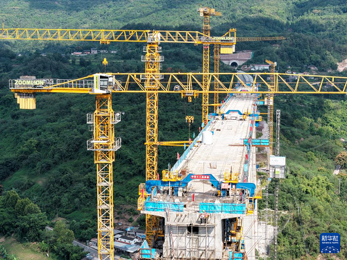 這是9月24日拍攝的渝萬(wàn)高鐵五步河雙線特大橋建設(shè)現(xiàn)場(chǎng)(無(wú)人機(jī)照片)。(新華社記者 唐奕 攝)