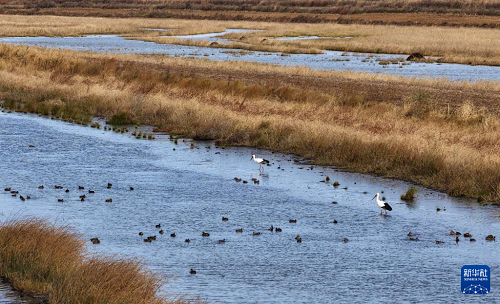 10月14日在黑龍江省同江市三江口國(guó)家濕地公園拍攝的東方白鸛和野鴨(無(wú)人機(jī)照片)。(新華社發(fā) 劉萬(wàn)平 攝)