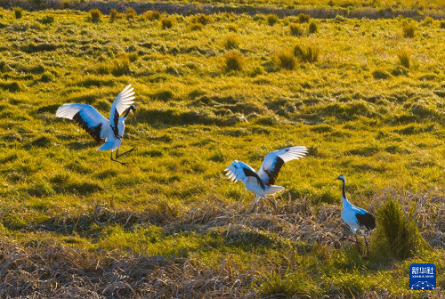 10月9日,在黑龍江撓力河國(guó)家級(jí)自然保護(hù)區(qū),丹頂鶴在濕地中活動(dòng)(無(wú)人機(jī)照片)。(新華社發(fā) 韓陽(yáng) 攝)