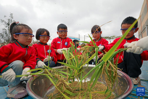 10月15日,云南省曲靖市陸良縣大莫古鎮(zhèn)中心幼兒園的孩子們在校內(nèi)勞動(dòng)基地體驗(yàn)收稻谷。(新華社發(fā) 王勇 攝)