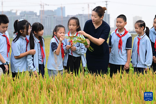 10月15日,江蘇省太倉市港城小學(xué)老師為孩子們講解水稻生長知識。(新華社發(fā) 計(jì)海新 攝)