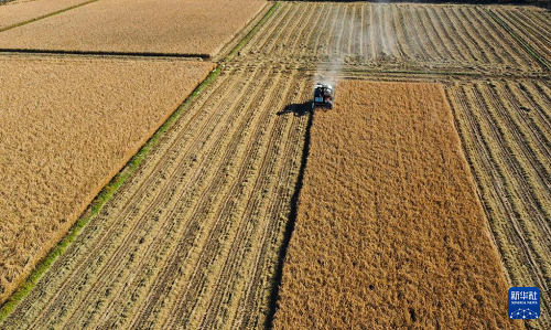 11月2日,河北省遵化市團瓢莊鎮(zhèn)山里各莊村農(nóng)民駕駛農(nóng)機收獲水稻(無人機照片)。(新華社發(fā) 劉滿倉 攝)