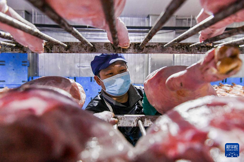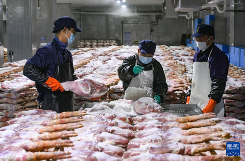 11月6日,在浙江省金華金年火腿有限公司車間內(nèi),技師在腌制火腿。(新華社發(fā) 時寬兵 攝)