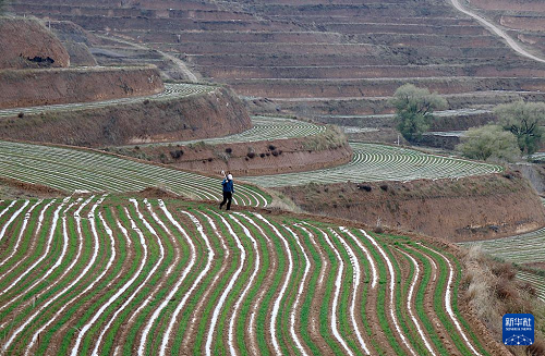 11月10日,在甘肅省平?jīng)鍪徐o寧縣三合鄉(xiāng)前咀村,農(nóng)民在覆膜后的冬小麥田里勞作。(新華社發(fā) 王毅 攝)