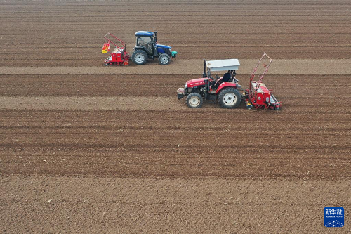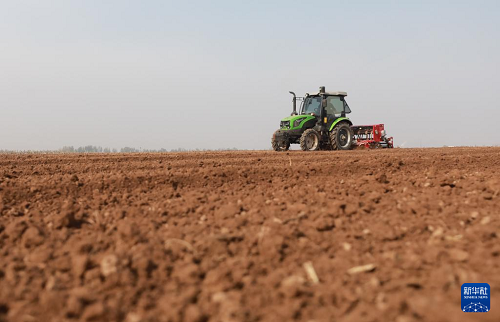 11月11日,農(nóng)民駕駛農(nóng)機在河南省焦作市溫縣黃河灘區(qū)播種小麥。(新華社發(fā) 黃福興 攝)
