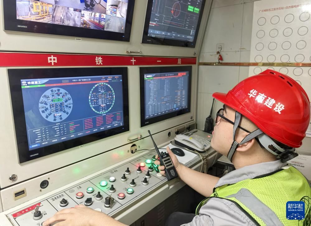 1月7日,工作人員在施工現(xiàn)場(chǎng)的控制室里調(diào)控機(jī)械設(shè)備。(新華社記者 盧漢欣 攝)