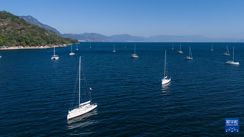 1月27日,游客在云南省玉溪市撫仙湖劃船游玩(無人機照片)。(新華社記者 高詠薇 攝)