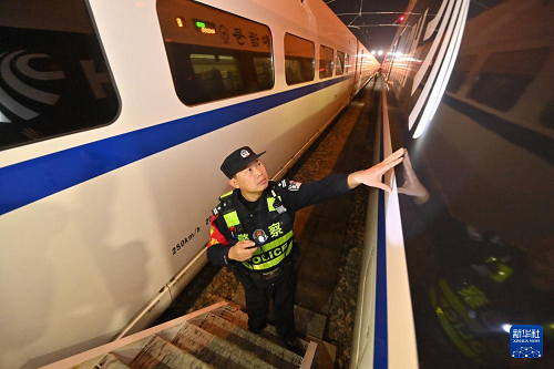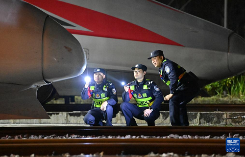 2月2日凌晨,南寧鐵路公安局南寧公安處長(zhǎng)崗嶺站派出所民警在南寧動(dòng)車所檢查列車安全情況。(新華社記者 陸波岸 攝)