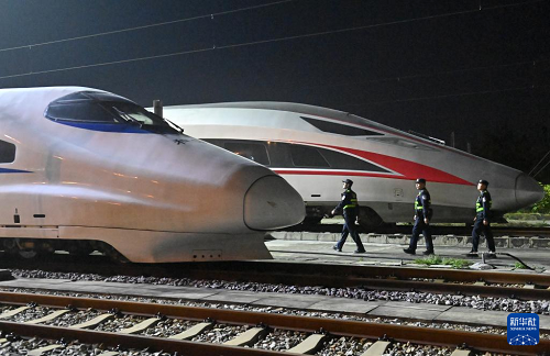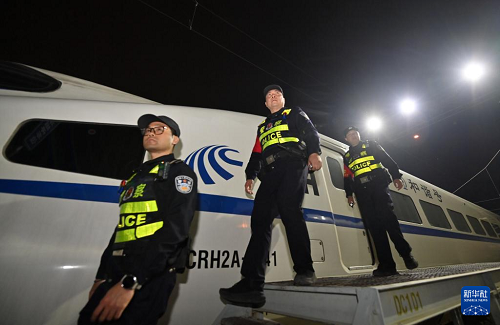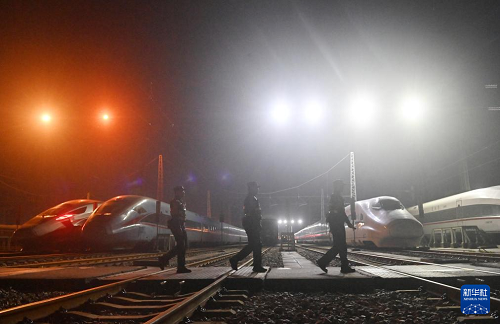 2月2日凌晨,南寧鐵路公安局南寧公安處長(zhǎng)崗嶺站派出所民警在南寧動(dòng)車所巡邏。(新華社記者 陸波岸 攝)