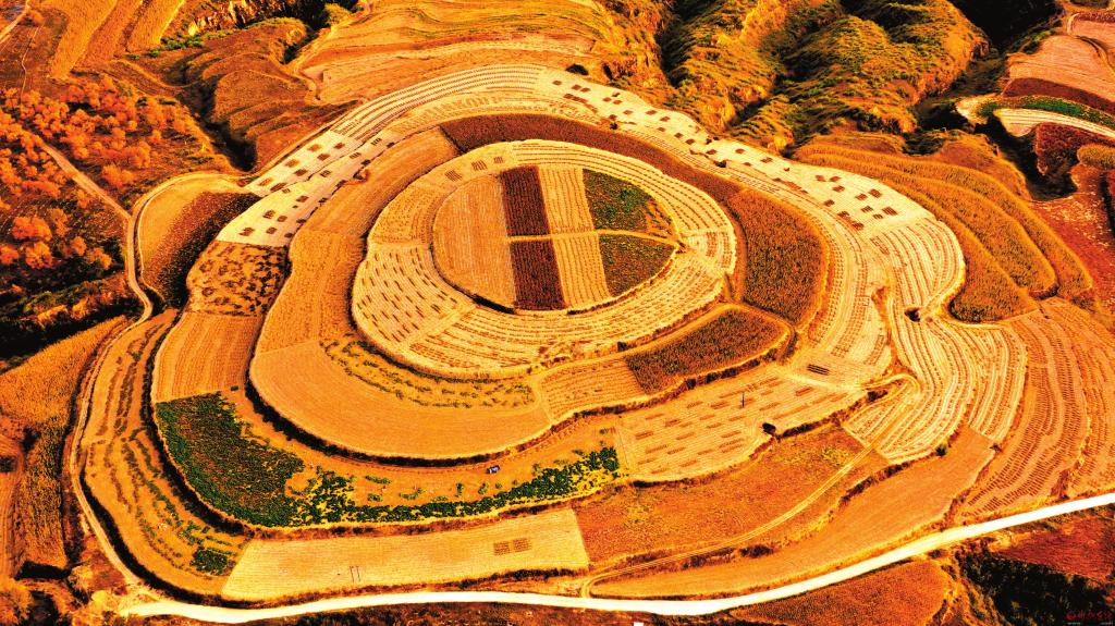 層層梯田滿目金黃,極目遠眺宛如畫卷。河曲縣鄉(xiāng)村錯落有致的梯田與曲折的道路相呼應(yīng),繪出一幅別致的田園風光畫。(何 帥 楊成林攝)