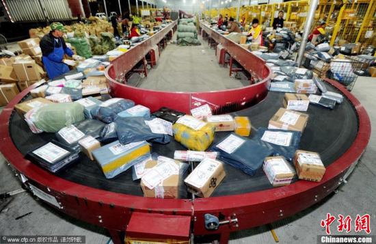 圖為快遞公司員工在忙碌分發(fā)郵件。圖片來(lái)源:CFP視覺(jué)中國(guó)