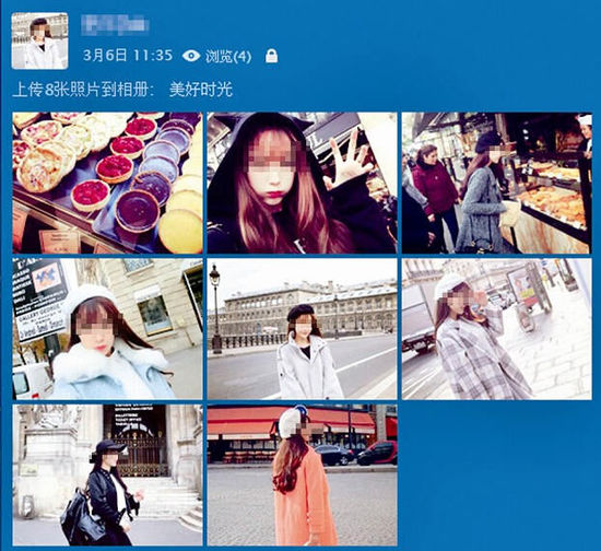 “最好找粉絲在10萬以下的網(wǎng)紅?!痹谖⒉┥希簭?qiáng)嫻熟地搜到一個(gè)名為“Panny”的模特,點(diǎn)擊其關(guān)注的好友,找到類似幾名網(wǎng)紅,讓記者下載她們的照片,用修圖軟件清除圖片上的水印,再上傳到QQ空間。魏強(qiáng)在QQ上假扮的“白富美”網(wǎng)名叫“Eiffel”,他還煞費(fèi)苦心地更新“Eiffel”的QQ空間。
