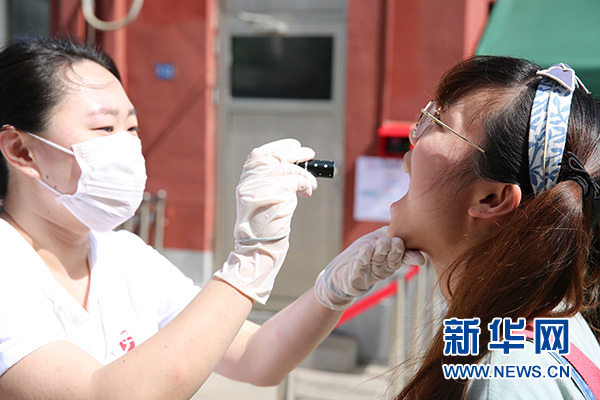 幼兒園保健醫(yī)生對“孩子”做進(jìn)一步晨檢。