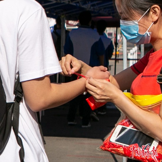 7月7日上午,北京市陳經綸中學門口,一位老師為考生戴上代表幸運的紅手鏈。中青報·中青網見習記者 曲俊燕/攝
