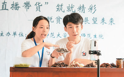 7月24日,在江西省吉安市新干縣潭丘鄉(xiāng)產(chǎn)業(yè)就業(yè)扶貧服務中心,江西師范大學暑期社會實踐大學生正在直播推銷當?shù)剞r(nóng)家小吃醬餅,助力鄉(xiāng)村振興。李福孫攝(人民視覺)