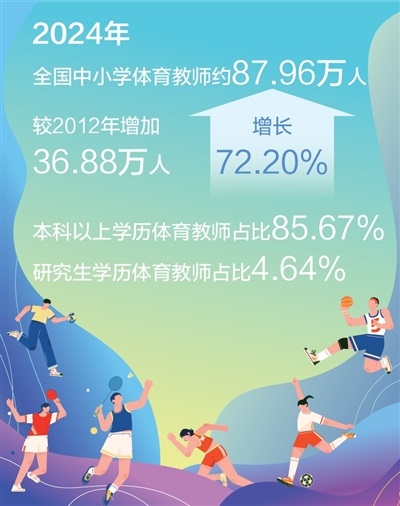 近年來,我國中小學(xué)體育教師隊伍不斷壯大。2024年全國中小學(xué)體育教師約87.96萬人,較2012年增加36.88萬人,增長72.20%。特別是近5年,全國體育教師數(shù)量增速明顯,師資補充力度加大。