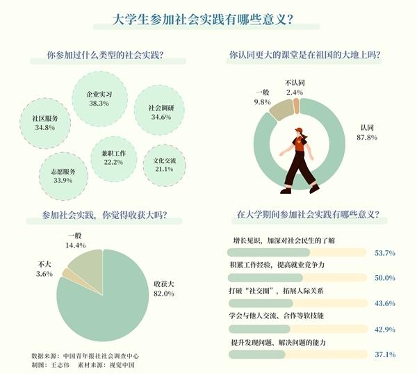 調(diào)查顯示,87.8%的受訪大學生認同,更大的課堂在祖國的大地上。對于參加社會實踐的意義,受訪大學生把增長見識,加深對社會民生的了解排在首位,獲選率為53.7%,積累工作經(jīng)驗,提高就業(yè)競爭力(50.0%),打破“社交圈”,拓展人際關系(43.6%)分別排在第二、三位。