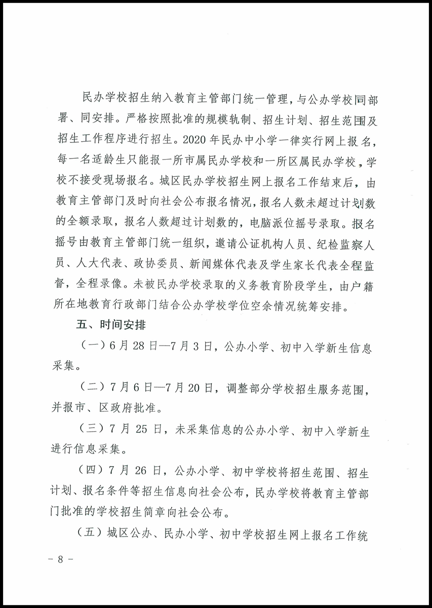 民辦學(xué)校招生納入教育主管部門統(tǒng)一管理與公辦學(xué)校同部署、同安排。嚴格按照批準的規(guī)模軌制、招生計劃、招生范圍及招生工作程序進行招生。2020年民辦中小學(xué)一律實行網(wǎng)上報名,每一名適齡生只能報一所市屬民辦學(xué)校和一所區(qū)屬民辦學(xué)校,學(xué)校不接受現(xiàn)場報名。