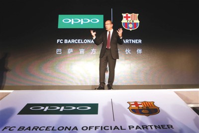 去年9月8日,西甲巴塞羅那俱樂部與OPPO手機在北京召開聯(lián)合新聞發(fā)布會,宣布自2015-2016賽季開始,OPPO正式成為巴塞羅那俱樂部官方合作伙伴。圖為巴塞羅那俱樂部副主席佩雷斯在新聞發(fā)布會上致辭。