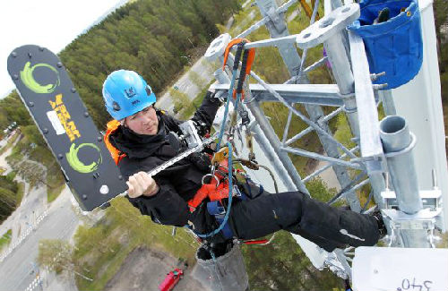 2016年5月12日,在芬蘭中部城市卡亞尼,工程師卡萊紐斯在一處基站塔頂調(diào)試華為公司生產(chǎn)的天線。(新華社)