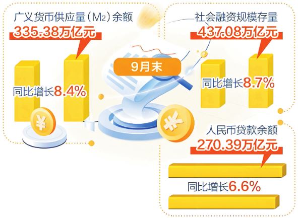 9月末,M2余額335.38萬(wàn)億元,同比增長(zhǎng)8.4%,在上年同期高基數(shù)背景下,仍保持較高增速;社會(huì)融資規(guī)模存量437.08萬(wàn)億元,同比增長(zhǎng)8.7%,比上年同期高0.7個(gè)百分點(diǎn);前三季度,社會(huì)融資規(guī)模增量累計(jì)為30.09萬(wàn)億元,同比多增4.42萬(wàn)億元。
