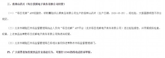 《通告》指出,北京市朝陽區(qū)市場監(jiān)督管理局執(zhí)法人員向“每日優(yōu)鮮”APP平臺(北京每日優(yōu)鮮電子商務(wù)有限公司)送達(dá)檢驗(yàn)報(bào)告,并開展現(xiàn)場檢查。經(jīng)查,上述食品由常熟每日優(yōu)鮮電子商務(wù)有限公司購進(jìn)并經(jīng)營。北京市朝陽區(qū)市場監(jiān)督管理局已將相關(guān)情況移送常熟市市場監(jiān)督管理部門。
