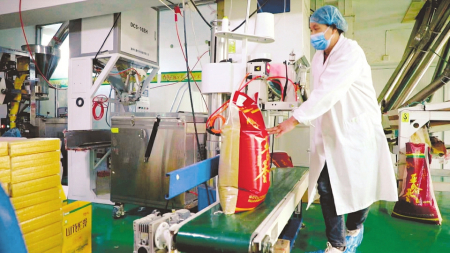 位于蔡家會鎮(zhèn)的興縣山花爛漫農業(yè)綜合開發(fā)有限公司,日精加工50噸谷子成套設備生產流水線上,經過初篩、精選、加工、包裝后的袋裝小米經過傳輸帶被送往庫房,等待裝車發(fā)貨?!拔覀兊漠a品涵蓋有機小米、綠豆、莜面、豇豆面、亞麻籽油等,年加工雜糧、油料可達4萬多噸。”公司董事長賀虎平介紹,自2005年“山花爛漫”商標注冊以來,已與興縣50多個自然村,916戶農戶,簽訂訂單農業(yè)近3萬畝,其中脫貧戶430多戶,戶均收入達到1.5萬余元/年。