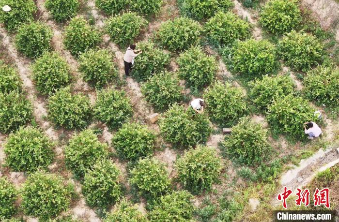 山西省運城市新絳縣澤掌鎮(zhèn)喬溝頭村,幾名花農(nóng)在田間采摘金銀花。(無人機照片)高新生 攝