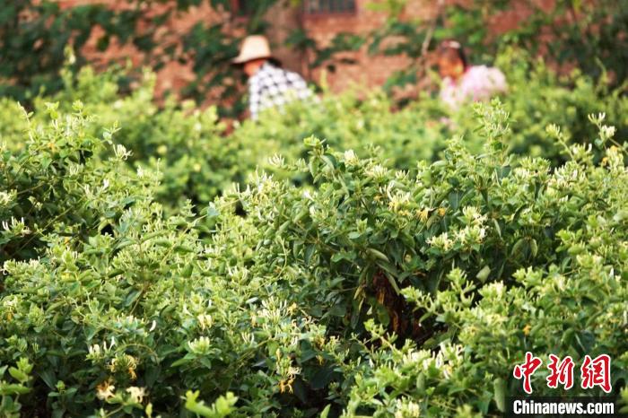 山西省運城市新絳縣澤掌鎮(zhèn)喬溝頭村,花農(nóng)采摘喜獲豐收的金銀花。高新生 攝