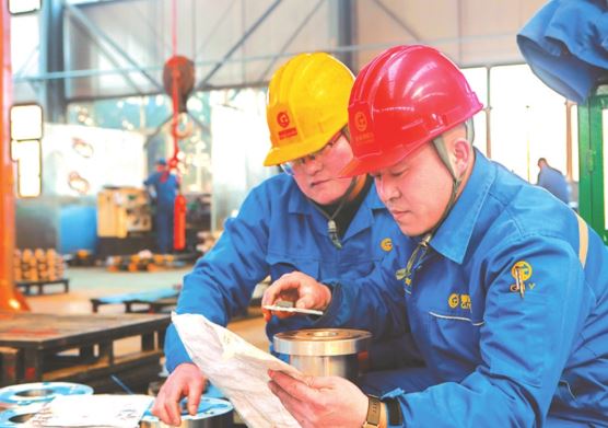 劉振偉(右)按照?qǐng)D紙測(cè)量法蘭。李春澤攝