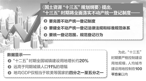 國(guó)土資源部今天公布的《國(guó)土資源“十三五”規(guī)劃綱要》提出,“十三五”時(shí)期將全面落實(shí)不動(dòng)產(chǎn)統(tǒng)一登記制度。