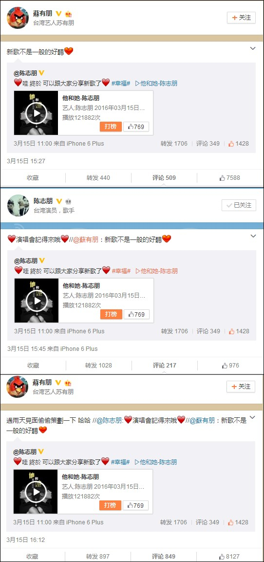 3月15日下午,臺灣歌手陳志朋在微博宣傳自己的新歌《他和她》,之前曾和陳志朋傳過不合的小虎隊另外一個成員蘇有朋第一時間轉(zhuǎn)發(fā)了該微博,并大贊“新歌不是一般的好聽”,幾分鐘后,陳志朋回復“演唱會記得來哦”,正當大家以為互動就這么結(jié)束的時候,蘇有朋“過兩天見面偷偷策劃一下 哈哈”。