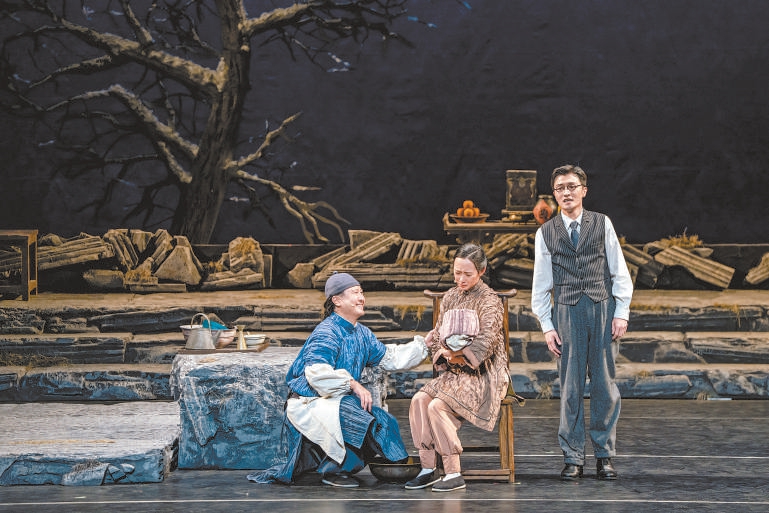故事中的“煙火氣”則體現(xiàn)在兩處舞臺(tái)設(shè)置上:垂下的紗簾幕自由展現(xiàn)出各種城市風(fēng)貌與相關(guān)故事元素;一棵高大的樹(shù)立于其中,帶來(lái)堅(jiān)硬又孤零的氣息。舞美設(shè)計(jì)李彪說(shuō):“北京題材的戲,我繞不開(kāi)這棵樹(shù),是冥冥之中的感覺(jué)。”在他一直以來(lái)的感受里,老舍先生就如這樣一棵樹(shù),“孤獨(dú)……又有生生不息的感覺(jué),雖然是一棵冬天的沒(méi)有樹(shù)葉的樹(shù),周圍環(huán)境也很寒冷,但樹(shù)立在那里,是又孤獨(dú)又溫馨的。”