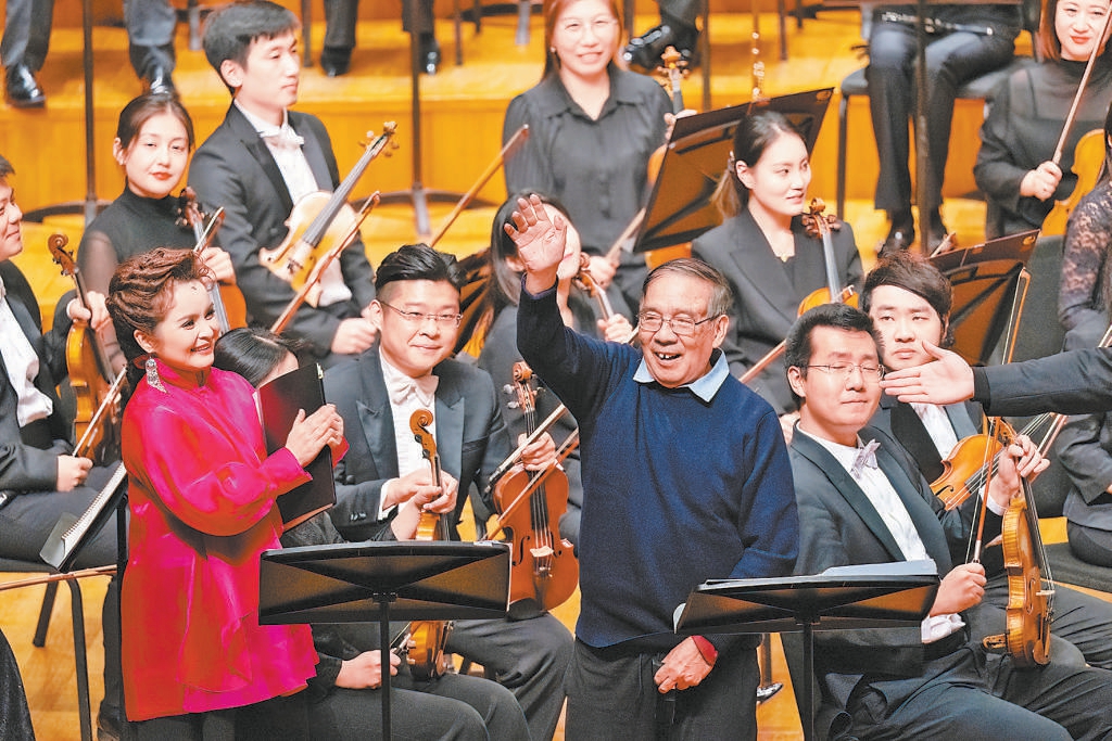 吳碧霞、黃訓國的演唱同樣精彩,特別是在《小河淌水》《看秧歌》等選段中,吳碧霞的美妙高音與混聲合唱的互動鮮明流暢,總博得熱烈喝彩。最后一曲《孳孳》唱響,余韻中,鮑元愷登臺向觀眾致意,筆耕不輟、用幾十載時光豐盈“炎黃風情”的作曲家,收獲全場經(jīng)久不息的掌聲。