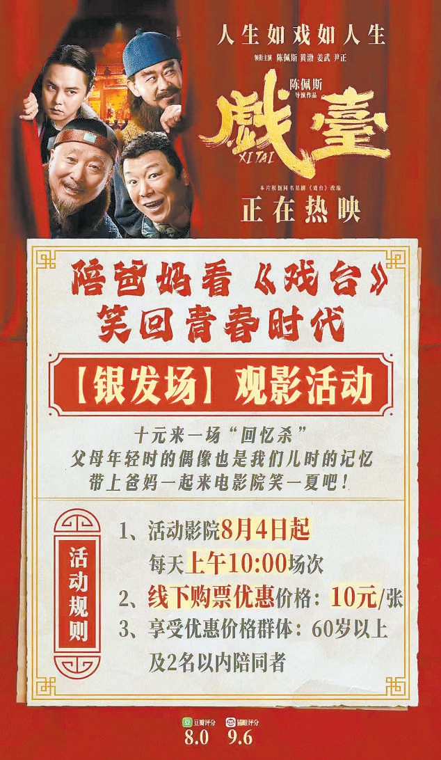 《戲臺(tái)》則推出“銀發(fā)場(chǎng)”特惠活動(dòng)。“效果特別好,線上線下都傳開(kāi)了,很多觀眾打電話來(lái)咨詢?!瘪T賀楠說(shuō),北京大約四分之一的影院都有“銀發(fā)場(chǎng)”,他所在影院的“銀發(fā)場(chǎng)”上座率在《戲臺(tái)》所有場(chǎng)次中是最高的。 (北京晚報(bào)記者 袁云兒)