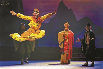 此外,該劇還利用舞臺(tái)技術(shù)突破了傳統(tǒng)戲曲的節(jié)奏,使之更為緊湊連貫。比如白骨精定下計(jì)謀要去偵探唐僧情況時(shí),舞臺(tái)光暗,一個(gè)發(fā)光小球飛升直達(dá)天幕,暗示白骨精元神飛出洞府,同時(shí)伴有類似影視音效作為烘托;而在唐僧狠心驅(qū)逐孫悟空時(shí),孫悟空向八戒沙僧交代完后,從上場(chǎng)門下場(chǎng),后場(chǎng)馬上就安排一個(gè)孫悟空替身吊威亞從上場(chǎng)口飛到下場(chǎng)口,過程連貫自然,這都是受到電影藝術(shù)啟發(fā)的創(chuàng)新。
