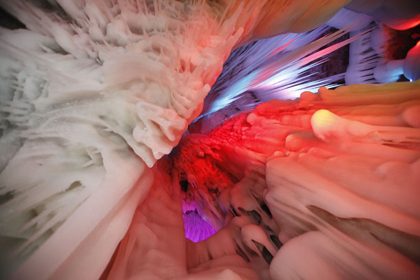 專家們稱,該冰洞位列全國一萬多個(gè)洞穴中僅有的九個(gè)冰洞之首。洞內(nèi)制冷機(jī)制最強(qiáng)、冰儲(chǔ)量最多,現(xiàn)開發(fā)近百米。分成上下五層,看冰洞須穿棉衣、戴手套,小心翼翼地游覽。通過鉆冰洞,下冰樓梯,過冰棧,可到各層觀光。每層可容納數(shù)十人。洞內(nèi)四周全是冰。由冰形成的冰柱、冰簾、冰瀑、冰花、冰佛、冰床、冰鐘、冰人、冰菩薩等,千奇百怪、不一而足。洞內(nèi)大大小小的景致或玲瓏剔透,或晶瑩奪目,或婀娜多姿,或雄偉壯麗,無不令人驚嘆,堪稱一個(gè)冰的絕妙世界。
