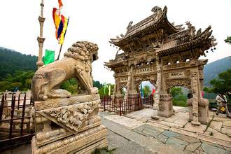 影壁中間鑲嵌有一石雕刻,文殊騎獅居中,人物花卉滿布四周,構(gòu)圖嚴(yán)謹(jǐn),神情逼真。向北登108級(jí)臺(tái)階即達(dá)山門(mén),門(mén)前漢白玉石獅一對(duì),勾欄小拱橋一座,石牌坊一座,旗桿高聳于兩側(cè),雕工均佳。其中石牌坊最引人神往,從基石,抱柱,斜戧,額枋,斗拱到瓦頂,脊獸,無(wú)一不是精雕細(xì)刻,人獸,花卉,流云,山水等分布殿內(nèi),玲瓏剔透,它共有三門(mén)六柱,呈“一”字形,整體雄偉壯觀,巧奪天工,據(jù)說(shuō)是由工匠耗時(shí)六年才建成。牌坊上刻有89條蛟龍,鱗爪俱現(xiàn),神態(tài)逼真;人物表情栩栩如生。游人觀后,無(wú)不交口稱贊,印象深刻。寺內(nèi)三座院落橫向排列,相互串通,又各有山門(mén),自成風(fēng)格。東院為殿院,依地勢(shì)分前后兩進(jìn),除山門(mén)外,中線上還有佛殿兩座,圍枝廂房配殿,塑像俱存,彩繪房和獻(xiàn)亭,曲廊環(huán)繞,雙塔高聳,其中普濟(jì)禪師塔雕尤為精致。距龍泉寺西北里許的山坡,有一座楊業(yè)的瘞骨塔,六角、三級(jí),高約10米。傳說(shuō)楊業(yè)死后,五郎將其尸骨葬此,并建塔紀(jì)念。宋太宗后來(lái)追封楊業(yè)為楊令公,故后人稱此塔為令公塔。