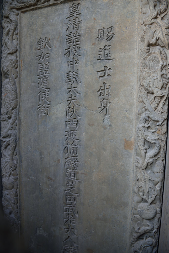 配坊實際上是一座功名石牌坊,上面刊載著武訪疇一家四代人的姓名及朝廷贈封的官爵,咸豐六年(1856)由武訪疇修建。這座石雕牌坊與其它牌坊最大的區(qū)別就是沒有題刻坊名,因此只能稱之為配坊。坐北向南,為四柱三間三樓單檐歇山頂結構,牌樓高8米,寬12米,坊體坐落在近1米高的長方形臺基上,立柱仍然采用夾柱石固定。坊頂覆蓋青瓦,正脊飾石雕貔貅裝飾,飛檐翹角,明樓檐下為“圣旨”牌,當心間設兩層小字板,第一層題刻:“贈資政大夫曾祖父廷桂,贈夫人曾祖母李氏;誥贈資政大夫祖父秉壁,誥贈夫人祖母吳氏;誥贈資政大夫父烈,誥封夫人母朱氏。陜西分巡延榆綏兵備道、加四級武訪疇謹建。”第二層題刻“大清咸豐六年歲次丙辰仲夏上院榖旦”。武訪疇借建坊要弘揚祖輩陰德,而祖輩的姓氏大名又不能題刻在母親的節(jié)孝牌坊上,所以,他必須另建一坊才能完整地表達心愿。實際上,這就是建造配坊的真正目的。也正因此在配坊題刻“龍光錫寵”、“鳳詔褒榮”、“克成先志”、“重裕后昆”等。