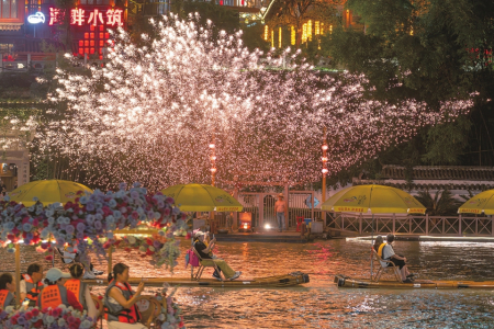7月9日,游客乘坐“龍游貢水”竹筏在貢水河上觀賞打鐵花表演。位于湖北省恩施土家族苗族自治州的宣恩縣城是一座“景城一體·主客共享”的國家4A級景區(qū)。近年來,當(dāng)?shù)夭粩嗤脐惓鲂碌摹褒堄呜曀敝穹?、烏篷船等體驗和觀賞項目,讓游客在璀璨燈火中沉浸式感受山區(qū)小城的夜色魅力。