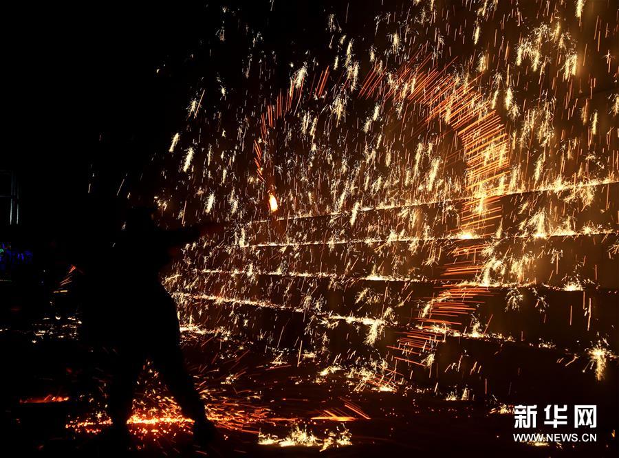 1月12日,河北磁縣開始舉行“打鐵花”慶新年活動?!按蜩F花”是以小煉鐵爐將生鐵化成鐵水后,用木板將鐵水加鋸末打上天空,鋸末在空中燃燒形成“鐵花火雨”四濺飛揚(yáng)的景象。打鐵花”是當(dāng)?shù)貧v史悠久的民俗娛樂活動。新華社發(fā) (趙鴻宇 攝)