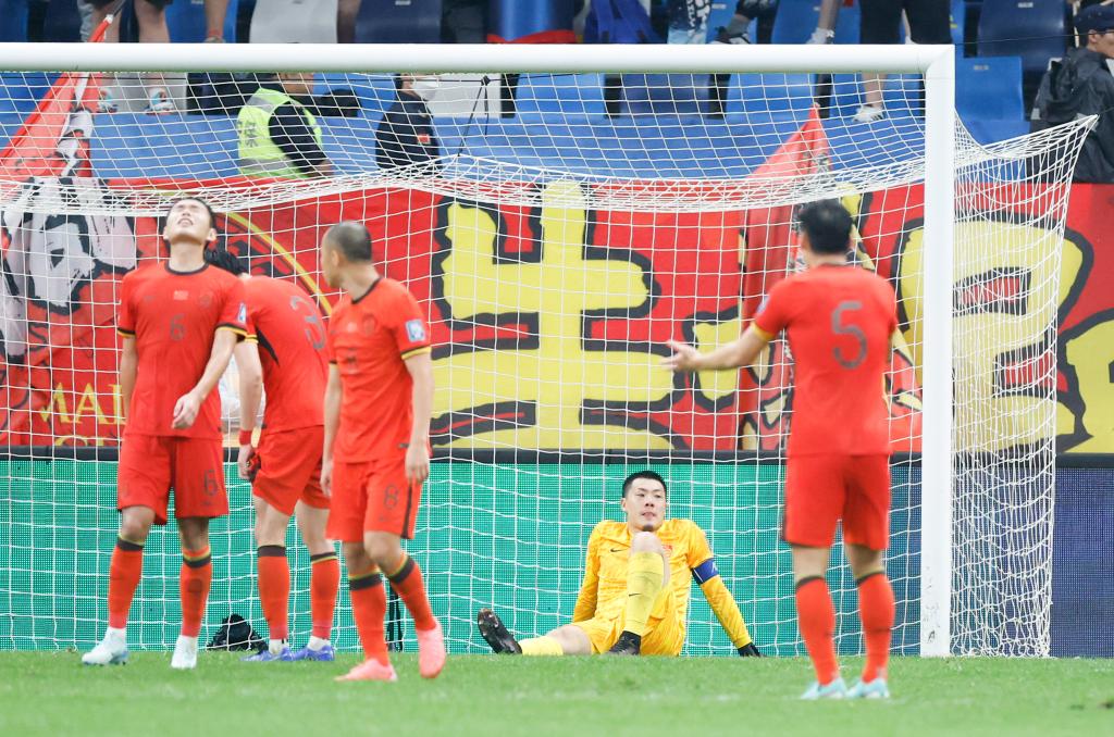 2024年9月10日,中國隊守門員王大雷(下)在球隊失球后。當(dāng)日,中國隊主場1比2不敵沙特隊。新華社記者 曹燦 攝