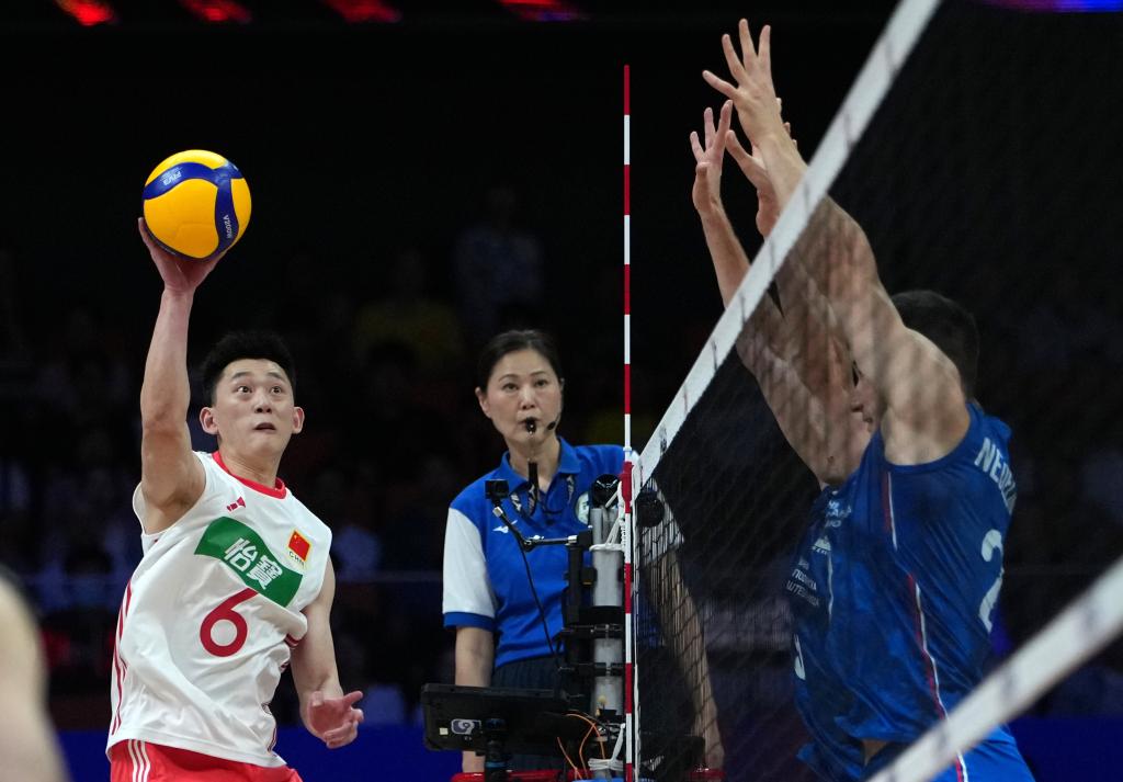 首局比賽,中國隊(duì)很快進(jìn)入狀態(tài),通過進(jìn)攻端的變化,有效破解了對手的網(wǎng)前防守,場面一度陷入膠著。雙方戰(zhàn)至23:23時,俞元泰扣殺得分為中國隊(duì)迎來局點(diǎn),塞爾維亞隊(duì)隨后扣球出界,中國隊(duì)25:23先勝一局。