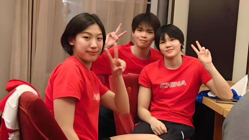 楊佩琪(右)、嚴(yán)窕珊(左)和徐海博(中)。中國游泳隊(duì)供圖