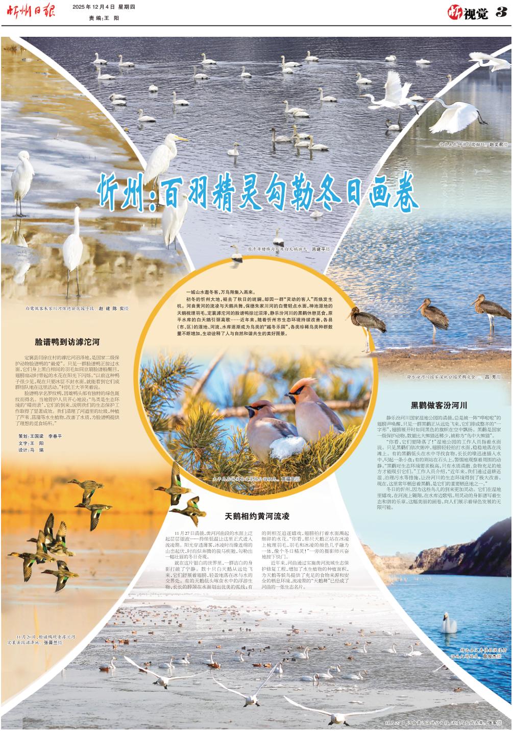 初冬的忻州大地,褪去了秋日的斑斕,卻因一群“靈動(dòng)的客人”而煥發(fā)生機(jī)。河曲黃河的流凌與天鵝共舞,保德朱家川河的白鷺輕點(diǎn)水面,神池濕地的天鵝梳理羽毛,定襄滹沱河的臉譜鴨掠過沼澤,靜樂汾河川的黑鸛休憩覓食,原平水庫的白天鵝引頸高歌……近年來,隨著忻州市生態(tài)環(huán)境持續(xù)改善,各縣(市、區(qū))的濕地、河流、水庫逐漸成為鳥類的“越冬樂園”,各類珍稀鳥類種群數(shù)量不斷增加,生動(dòng)詮釋了人與自然和諧共生的美好圖景。