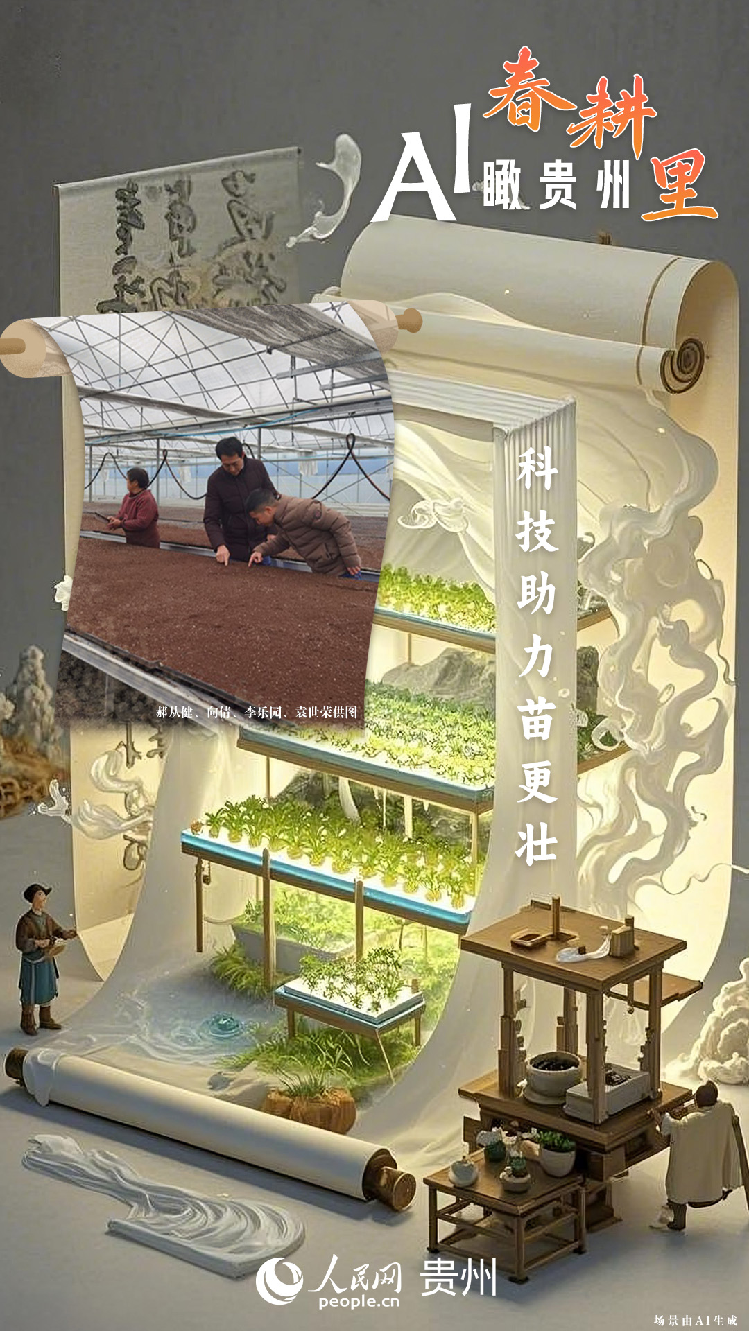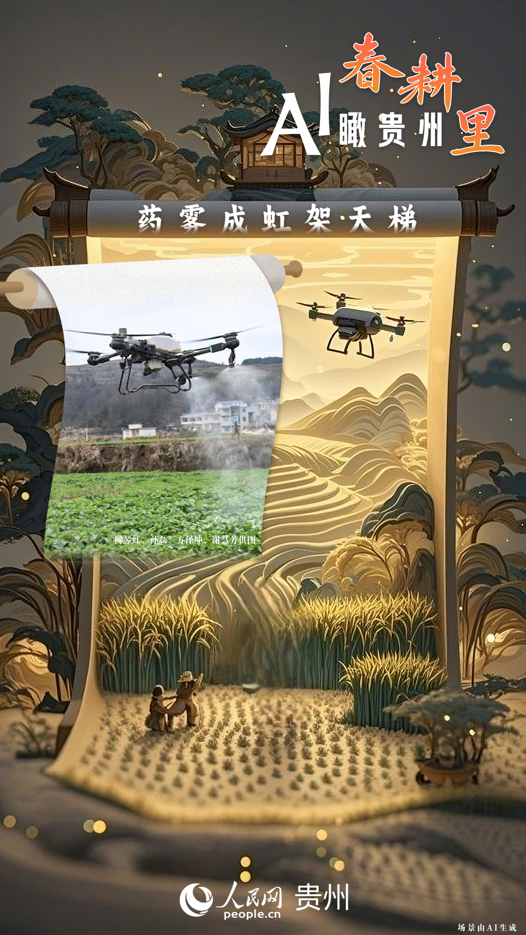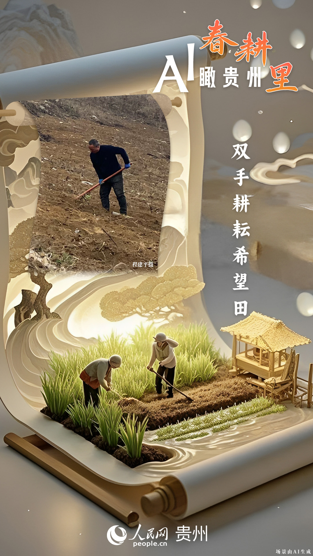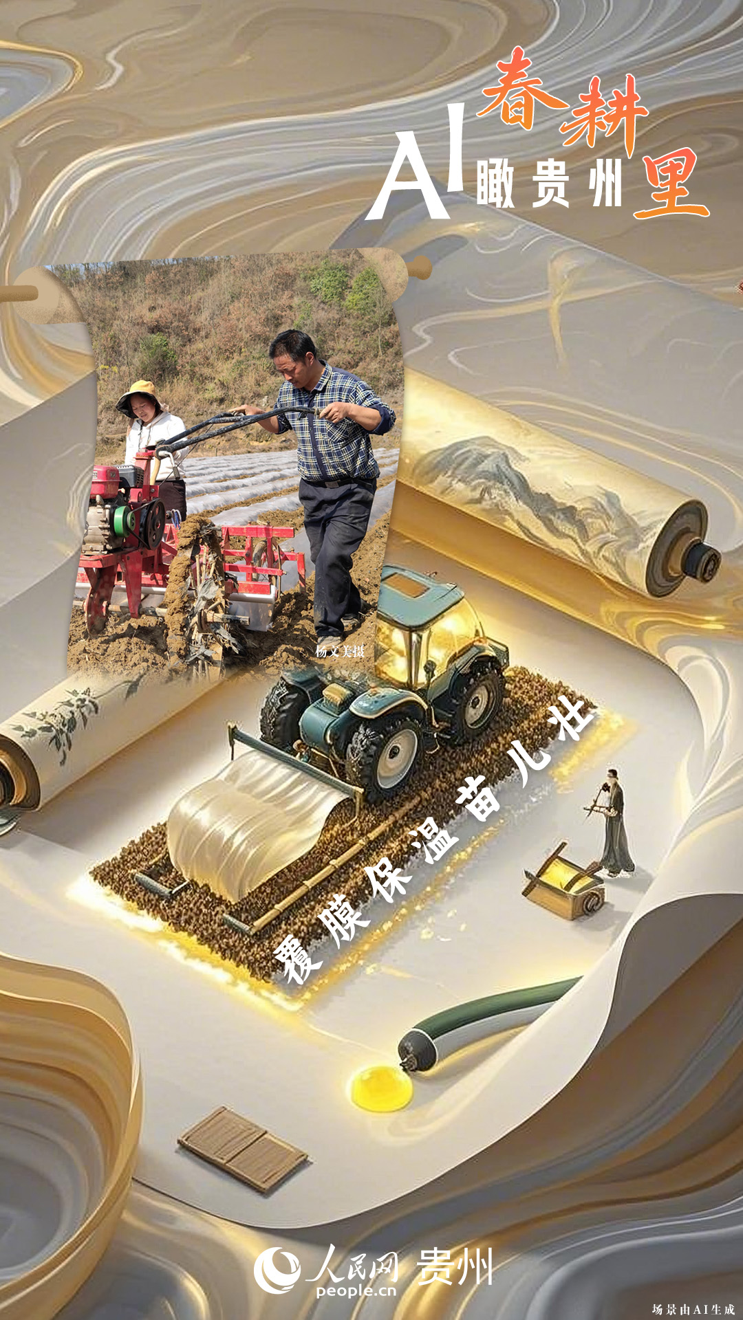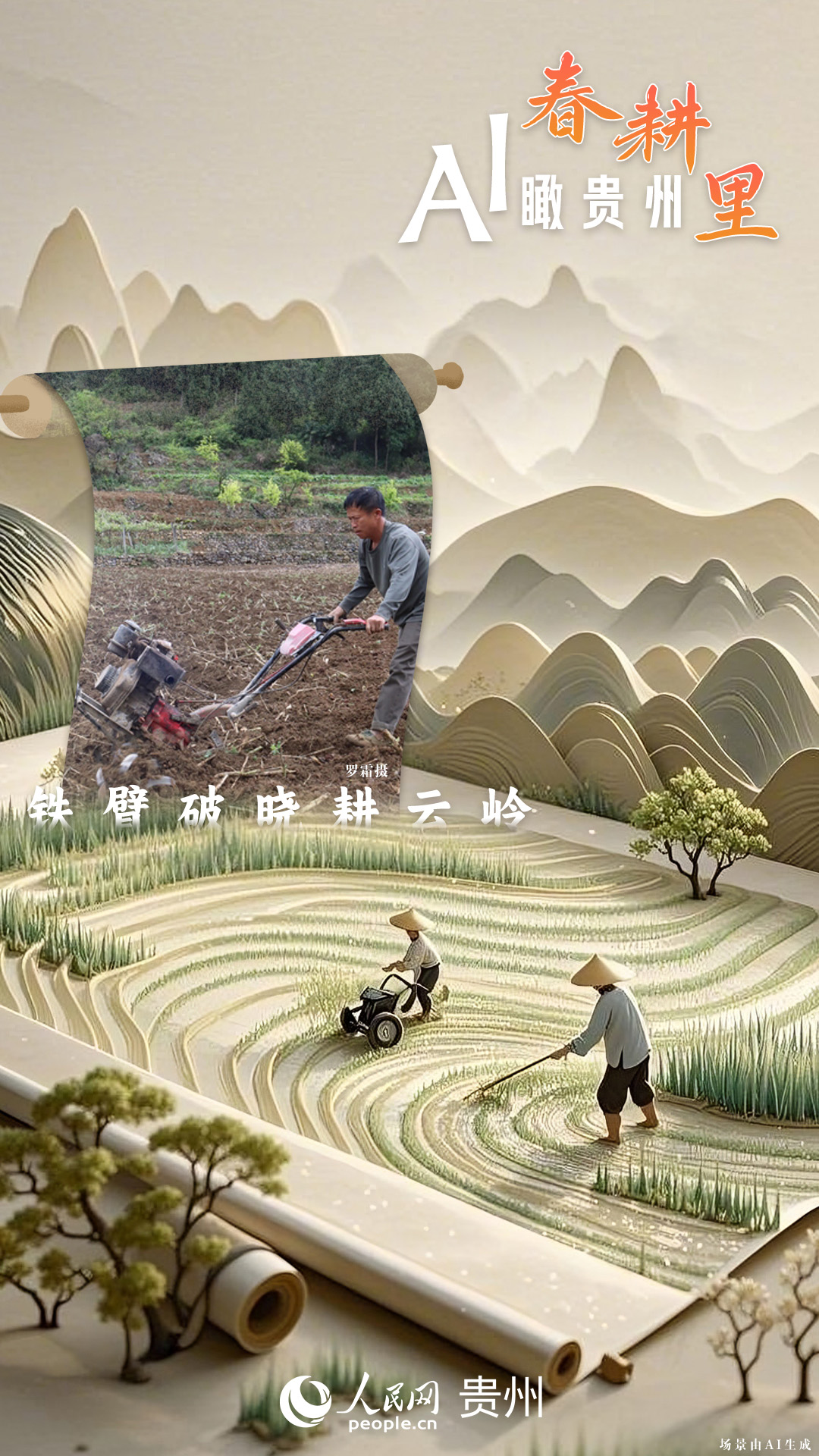 春回大地,萬物復(fù)蘇,黔地山川間正上演著一場生機(jī)勃勃的春耕盛景。傳統(tǒng)農(nóng)耕與現(xiàn)代科技在這里交織,描繪出一幅幅充滿希望的畫卷。 春耕不僅是農(nóng)時的序曲,更是科技與土地對話的現(xiàn)場。在貴州這片喀斯特地貌與民族文化交織的土地上,春耕正經(jīng)歷一場靜默的變革:無人機(jī)掠過千年梯田,算法解析紅壤墑情,覆膜機(jī)織就“智能外衣”,而彎腰勞作的農(nóng)人,依然用繭手傳遞著古老農(nóng)耕文明的溫度。 本期跟隨AI一起描繪貴州春耕里的故事。