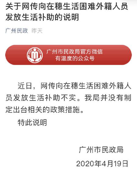 真相:廣州市民政局19日發(fā)表說明:近日,網(wǎng)傳向在穗生活困難外籍人員發(fā)放生活補助不實。我局并沒有制定出臺相關(guān)的政策措施。